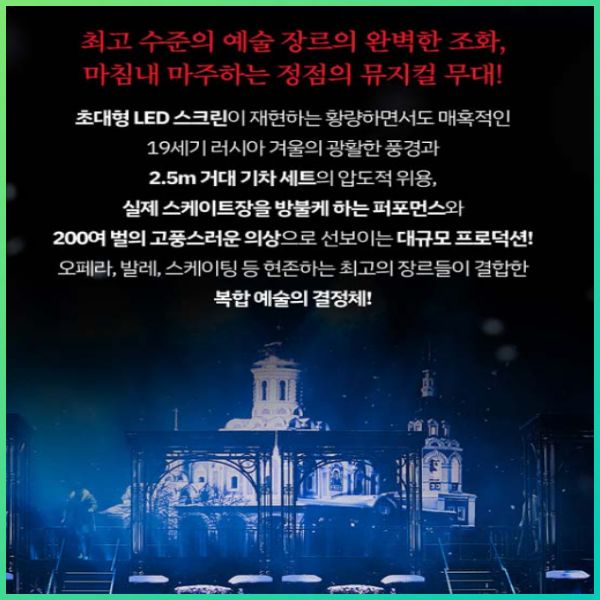 뮤지컬 안나카레니나는 실제 기차가 무대 위로 등장하는 듯한 착시 효과와 거대한 아이스링크 장면을 통해 러시아의 광활한 풍경을 완벽하게 재현해 냅니다.