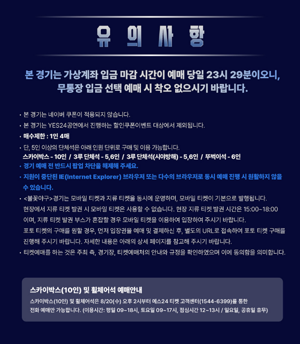 ※ 불꽃야구는 예매처 일반 규정과 동일하며, 착오 없으시길 바랍니다.