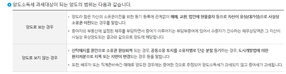 - 단, 1세대 1주택 비과세, 장기보유특별공제 등 예외 조항에 따라 면세 가능.